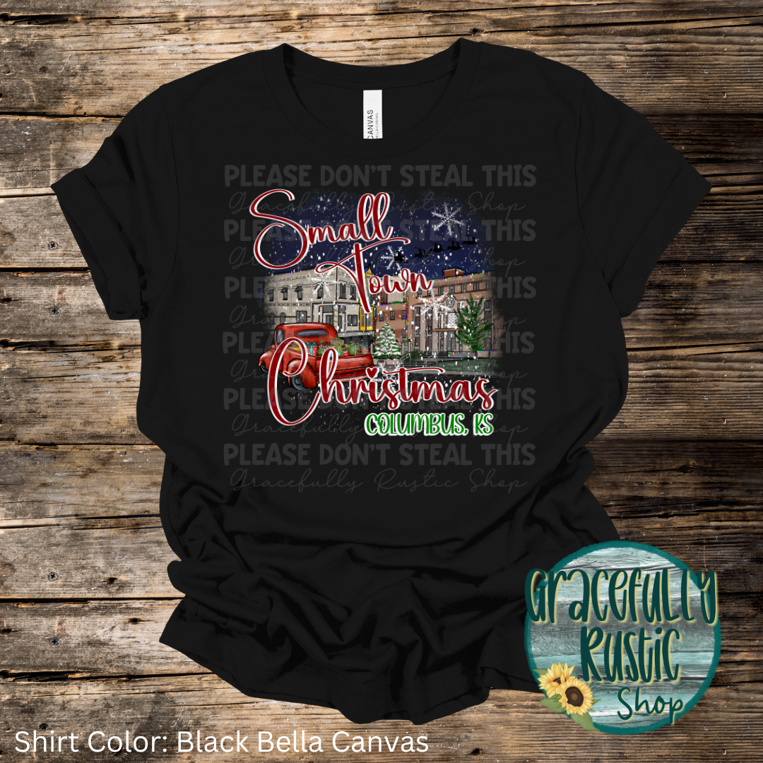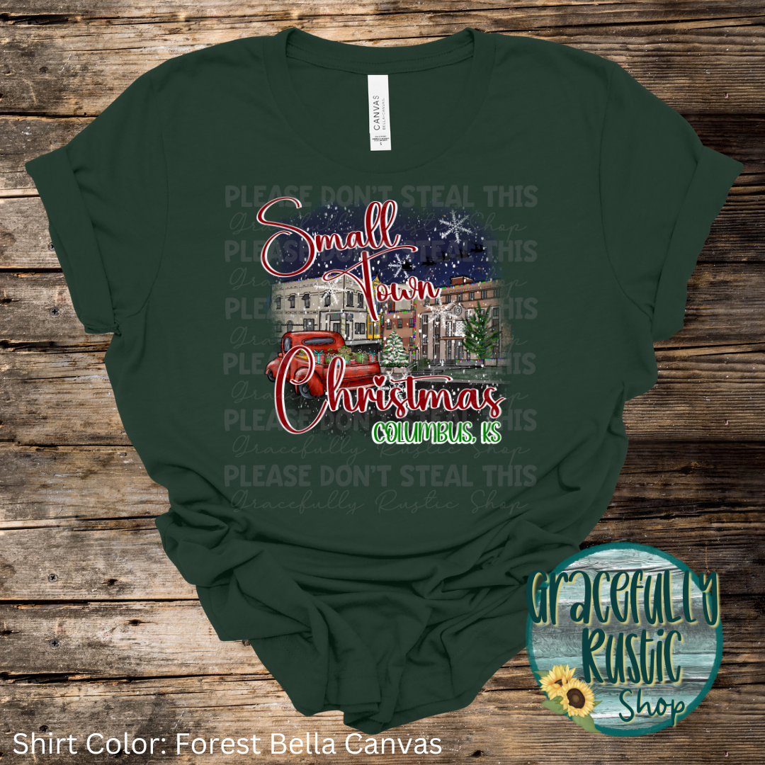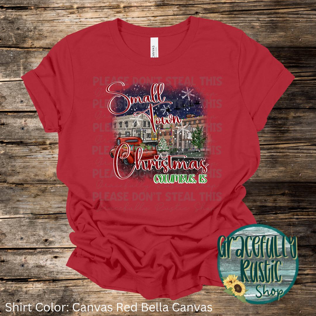 Introducing our "Small Town Christmas" shirt, designed to capture the magic of the holidays in Columbus, KS! This festive tee features a charming downtown scene with twinkling lights, vintage truck with presents, and a Christmas tree, perfect for showing off your love for small-town charm.